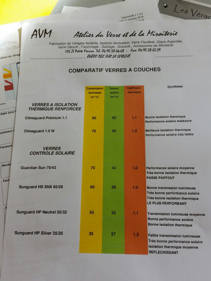 J'ai demandé au vérandiste de me donner les différentes caractéristiques des verres utilisés. En facade il s'agit du Climaguard 1.0 W et en toiture le Sunguard HP Silver 35/26.