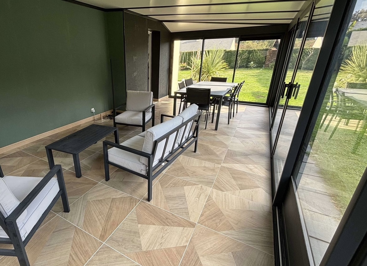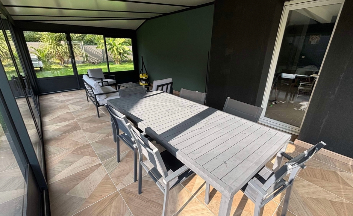 Top ! Ta véranda moderne se coordonne bien avec ta maison.