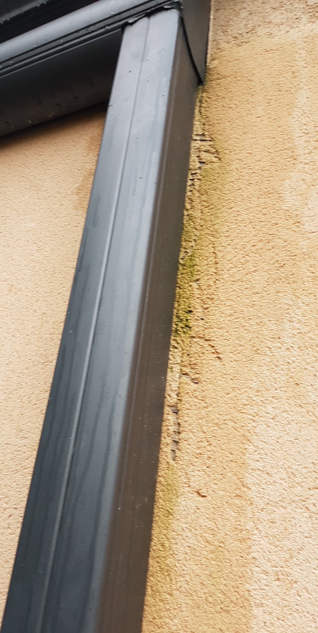 Ci-dessous photo prise le 04/06/2020 après les fortes pluies de la journée, les infiltrations attaquent dorénavant le côté gauche de la descente d'eau de pluie !