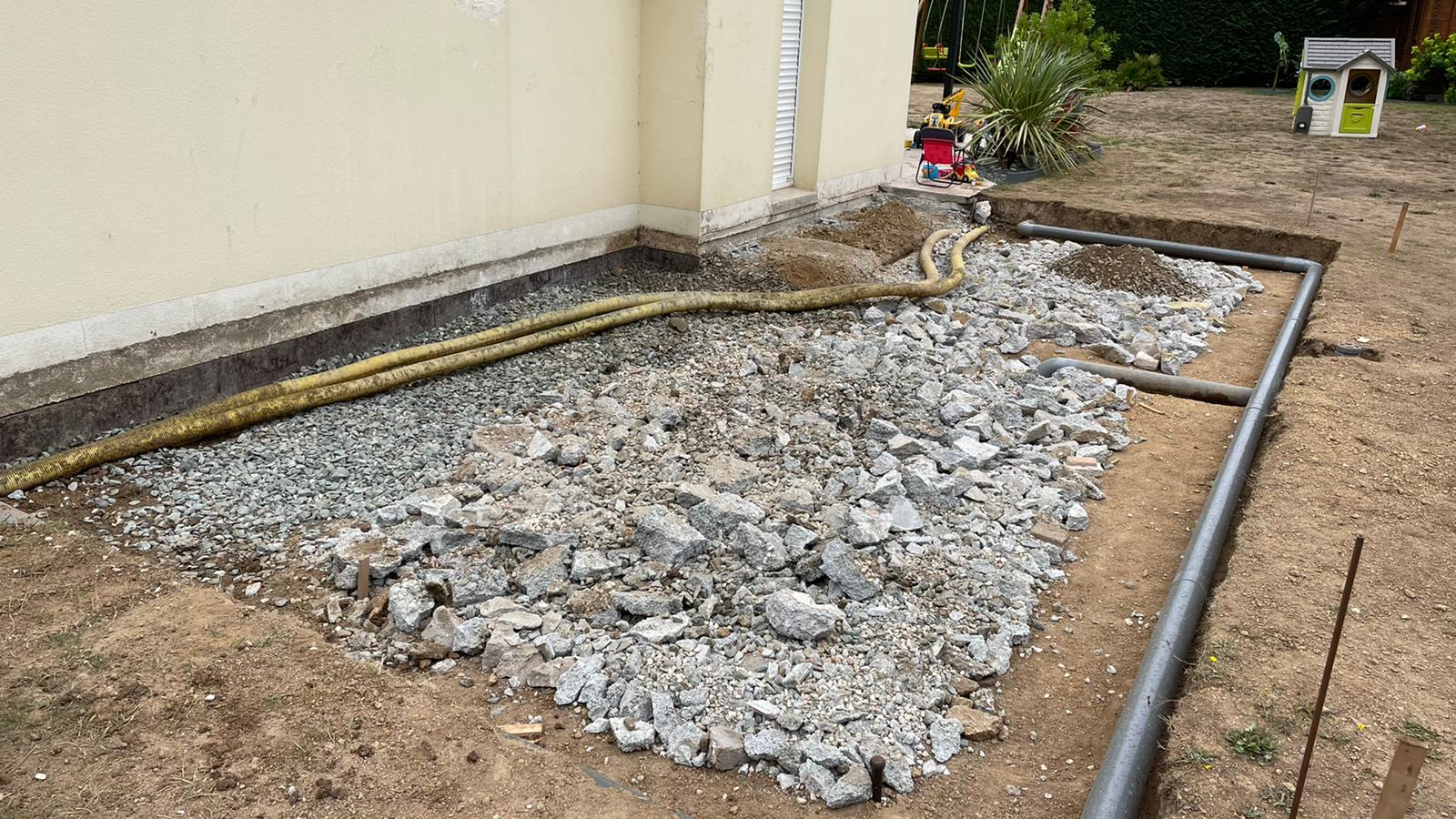 Nous avons creusé (pioches, pelles et motoculteur) entre 40 et 45cm pour faire le terrassement.