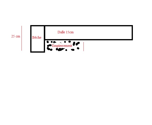 Pas d’empierrement en périphérie mais nous pensons réaliser comme une bêche de rive périphérique puisque le béton armé sera de 15cm de dalle + la hauteur de l’empierrement, soit 10cm.