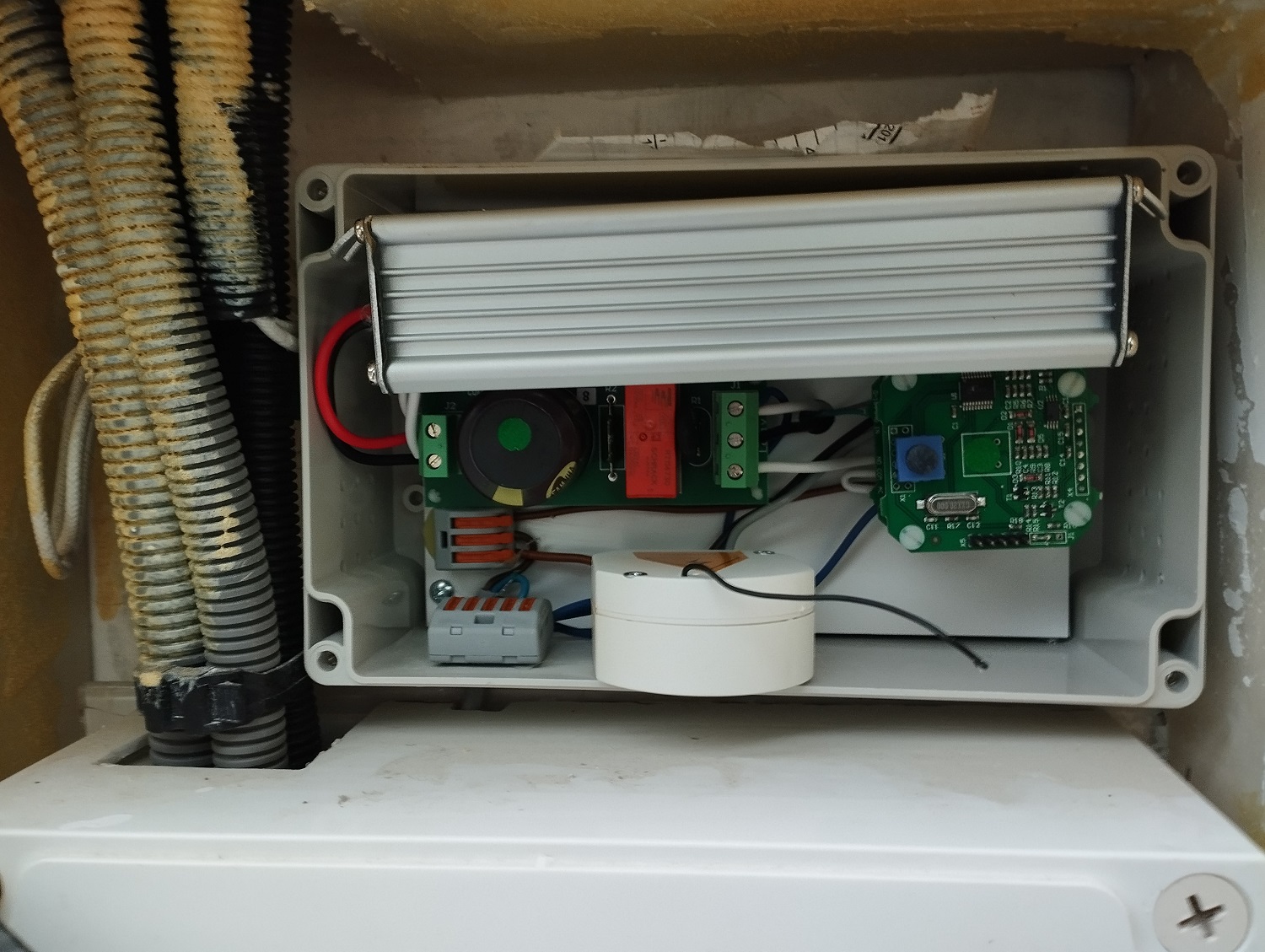 bonjour et merci du conseil !après diverses tentatives je me suis résolu à dégager électronique inutile et surement HS surtout que tout cette électronique était là pour faire fonctionner l'inter en mode variateur en plus !! bref,,,alors dommage mais pas le choix puisque dans mon secteur ,un kit à 30 euros sur Amazone récepteur 220 v + 2 interrupteurs (miracle sans fil sans piles en plus) sacré Chinois!!!j'ai fais sauté la partie électronique et gardé que le transfo .donc bien allégé mon boitier ! et tout refonctionne parfaitement avec le coté variateur en moins mais jamais utilisé ou presque!!je joins photos! et merci pour réponse!!