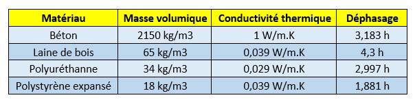 Voici un comparatif du déphasage de certains matériaux (l'épaisseur pour la comparaison est de 10cm) :