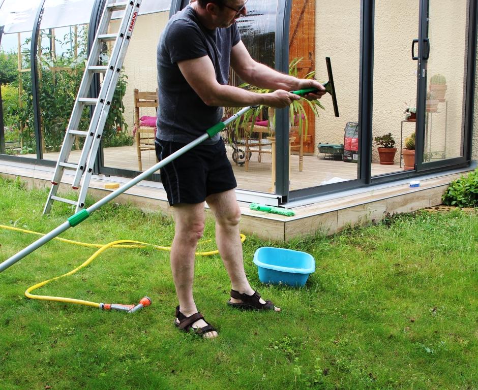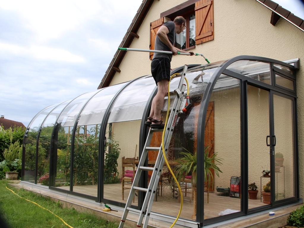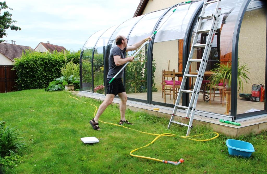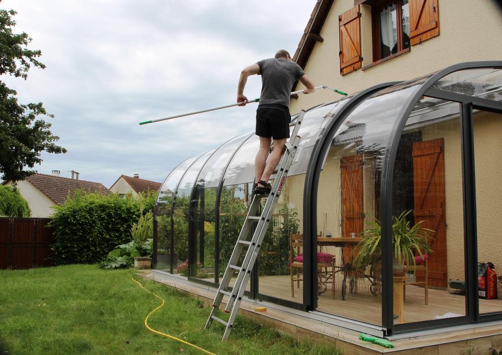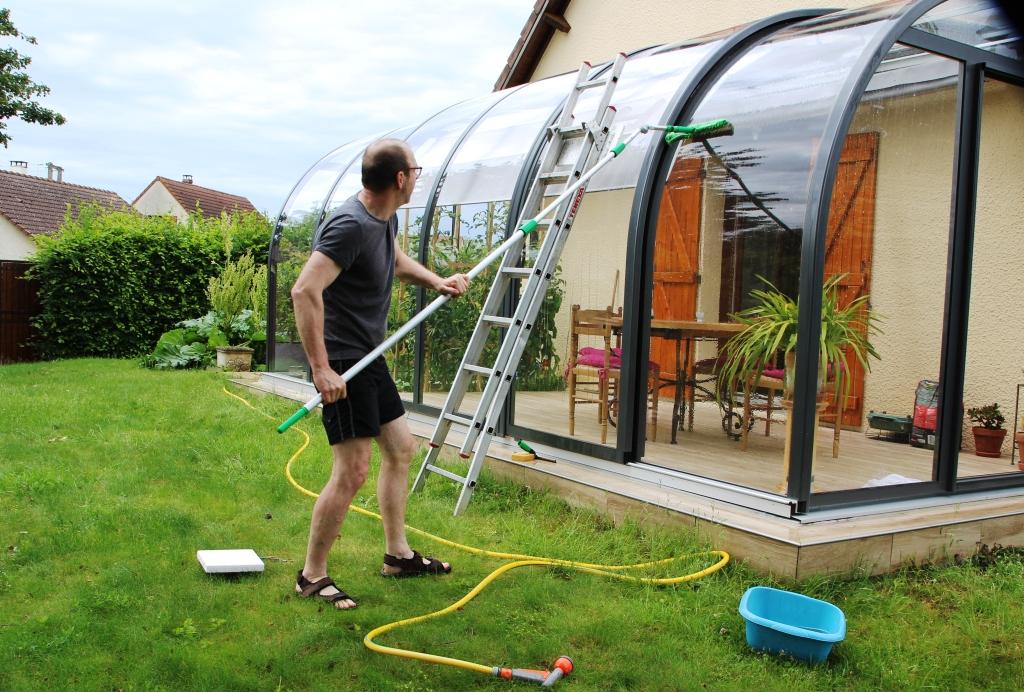 Pour l'entretien j'ai opté pour un balai télescopique. Ceci m'évite de monter sur la structure.