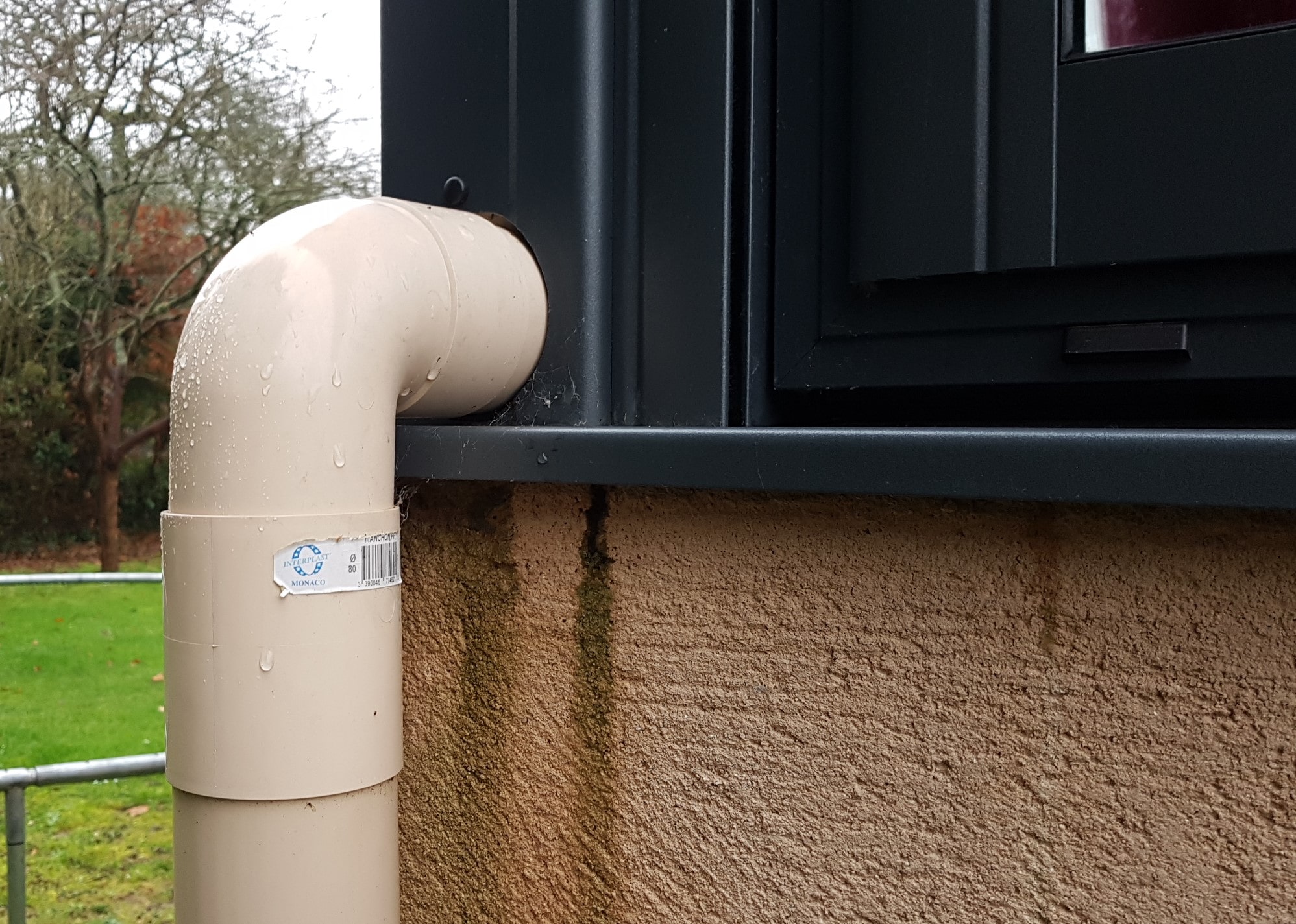 Ci-dessous photo prise le 04/06/2020 après les fortes pluies de la journée, les infiltrations attaquent dorénavant le côté gauche de la descente d'eau de pluie !