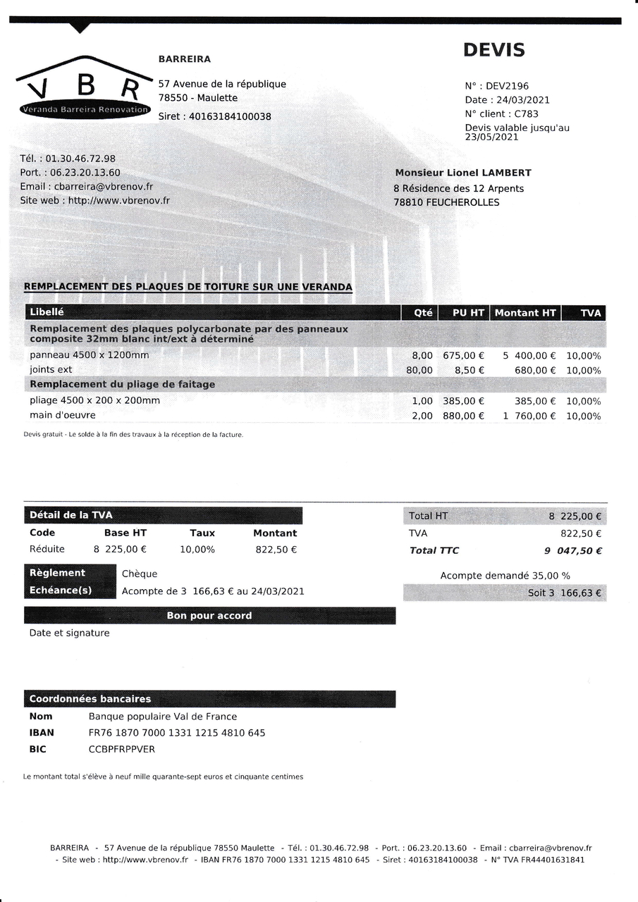 Bonjour Martin et merci pour tes remarques. J'attends toujours le devis de Véranda Confort . Cette société propose une toiture "Top 65" en mousse polyuréthane prise en sandwich dans 2 tôles d'aluminium et un polycarbonate reflex de 55 mm. Il est très probable que nous choisissions la toiture "Top 65" pour améliorer l'isolation thermique. Autre point important est le fait que ce sont eux qui ont fabriqué et posé notre véranda en 2000 alors que je ne connais pas VBR trouvé sur internet. J'ai également demandé aux deux sociétés la réfection des joints silicone extérieurs qui sont facturés 680 € HT par la Sté VBR. Je te tiendrai au courant. Bon dimanche.js-martin a écrit : 27 mars 2021 23:31 Merci M@rco.