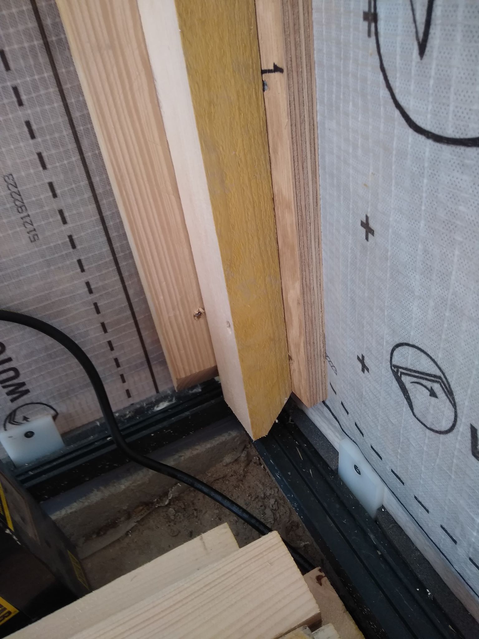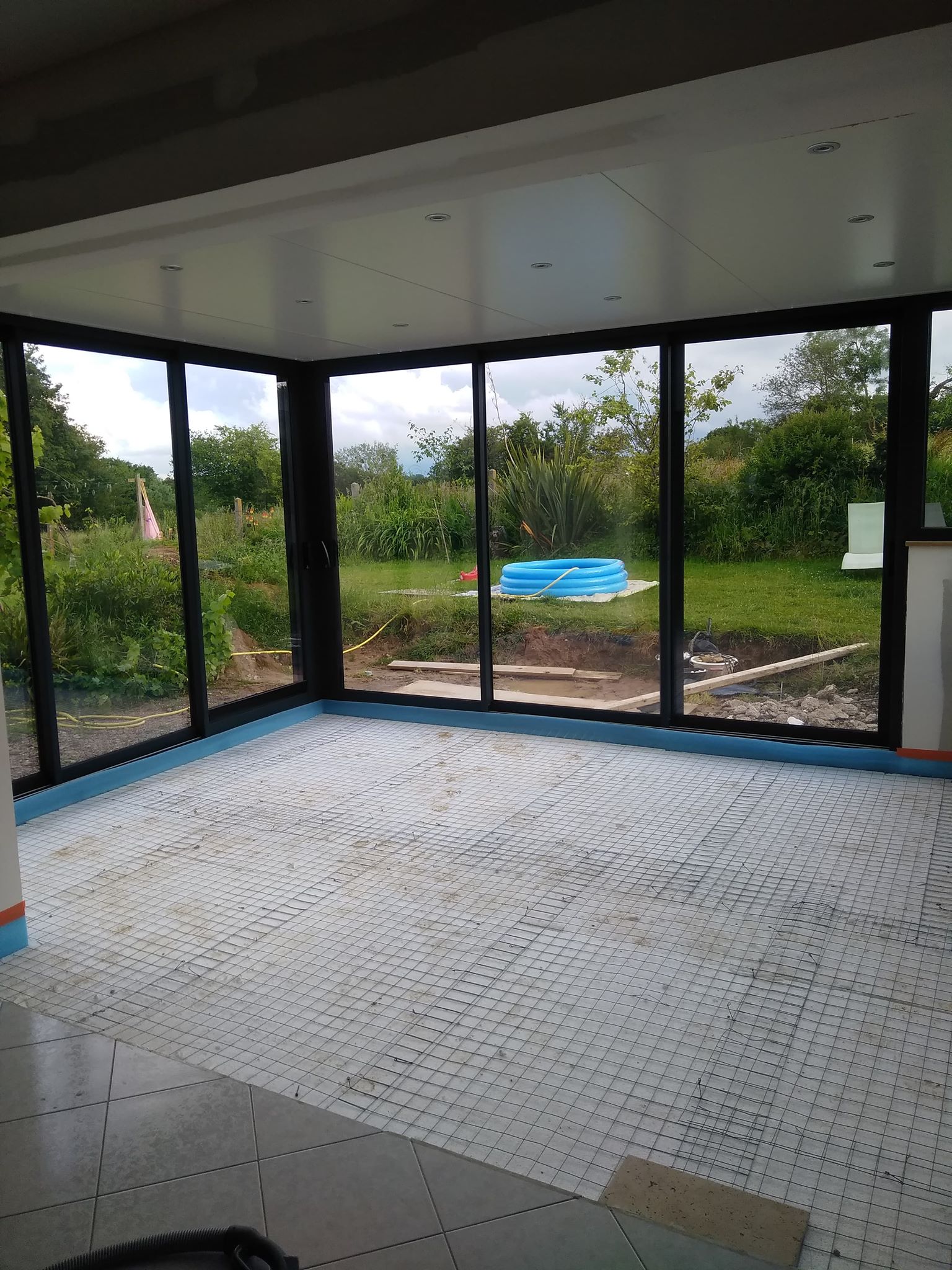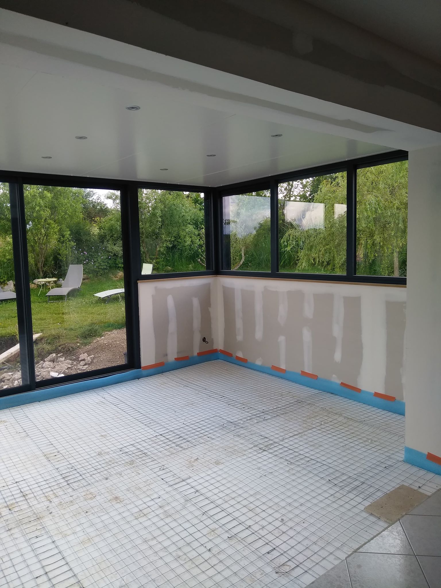 Comme on dit il y a pas de problèmes, il y a que des solutions... Les monteurs sont passés cet après midi refaire quelques joints, la fuite venait de la liaison fenêtre montant. Pour les câbles, on a décidé avec le plaquiste de faire un doublage du muret plus épais et passer les câbles dans la chape.