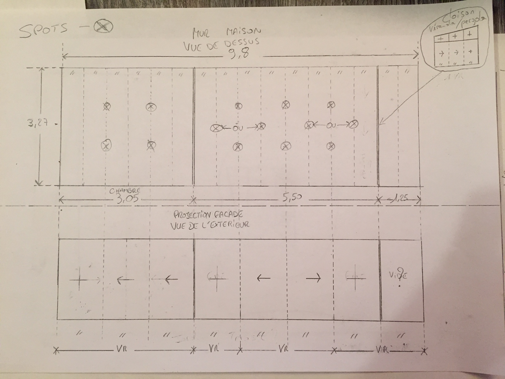 Si se sont des spots LED performants, de 250 Lumens / spot, disposés comme je l'ai fait sur mon croquis en vue aérienne, cela devrait aller, théoriquement 1 spot / 2.5 m².FABE99 a écrit :option