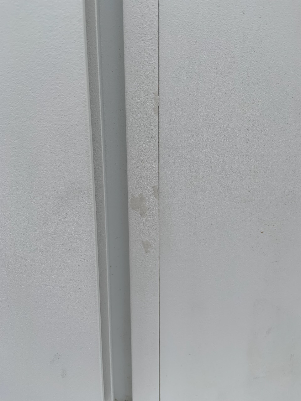 Les poseurs ont aussi remonté les tablettes qu'ils avaient démonté à cause d'un problème de teinte. Une cornière qui se pose juste dessus est simplement dégueulasse sur plus d'un mètre! Il ne s'agit pas d'un simple choc ou égratignure cette fois! Pourquoi l'avoir remontée dans cet état? Juste incroyable...