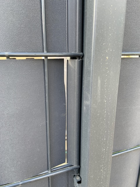 Autre chose: une clôture constituée de panneaux rigides et de lames occultantes horizontales a été commandée et installée le 9 mai par cette même société. Cependant les lames occultantes ont été coupées trop courtes et ne sont plus maintenues à leurs extrémités. Le remplacement de la quasi-totalité des lames a commencé cette après-midi!