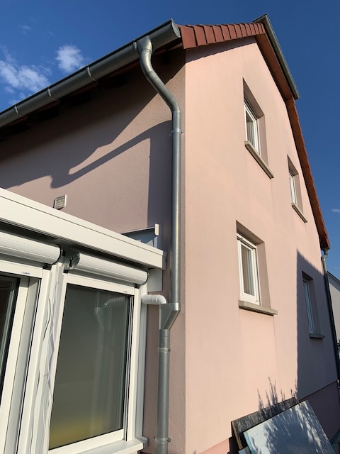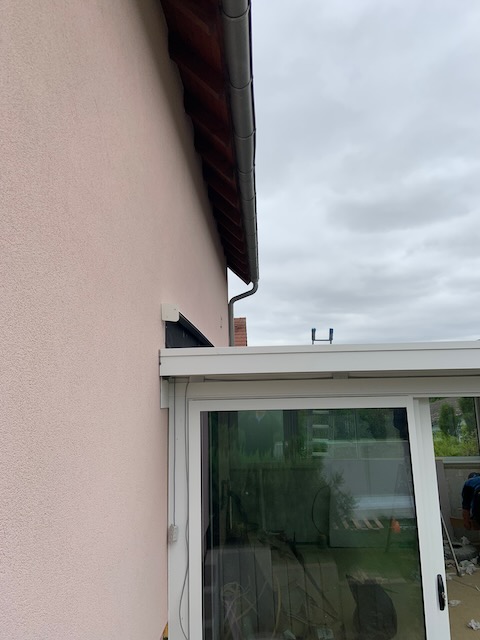 J'ai récupéré ma descente de gouttière, juste décalée de quelques centimètres à droite! Et la véranda y est connectée à l'aide d'un "raccord jambon".