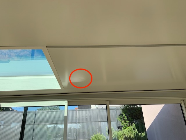 Plus embêtant, j'ai aussi remarqué en cette fin d'après-midi, lorsque la lumière du jour est rasante, un défaut en forme de creux au niveau du plafond. A ce stade, je pense qu'il n'y a rien à espérer...